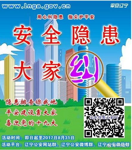 為深入貫徹落實(shí)習(xí)近平總書(shū)記系列重要講話精神,充分發(fā)揮全省“網(wǎng)上公安機(jī)關(guān)”平臺(tái)作用,遼寧省公安廳從即日起至8月31日,組織全省公安機(jī)關(guān)依托各級(jí)公安政務(wù)網(wǎng)站、公安政務(wù)微博、公安政務(wù)微信平臺(tái),集中開(kāi)展“安全隱患大家糾”活動(dòng),全面開(kāi)啟遼寧公安“查患治患”工作的“互聯(lián)網(wǎng)+”模式。