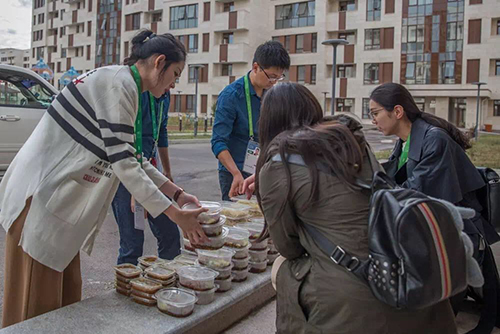 聽了介紹,更加渴望見到我們的大廚啦。劉芳總監(jiān)為我們提供了一個便利,讓我們趁大廚送飯的時候近距離接觸大廚。隨后我們來到世博村內(nèi)的送餐地點,有幸看到兩位大廚正在給志愿者們分發(fā)盒飯。
