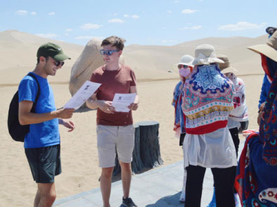 在敦煌的鳴沙山與月牙泉,兩名英國劍橋大學(xué)的大學(xué)生對(duì)“一帶一路”和“絲綢之路”概念的熟知程度令團(tuán)隊(duì)成員十分驚訝,外國青年對(duì)中國的文化歷史的濃厚興趣也令交流采訪十分順利和有趣。