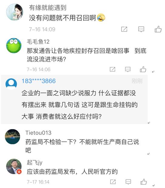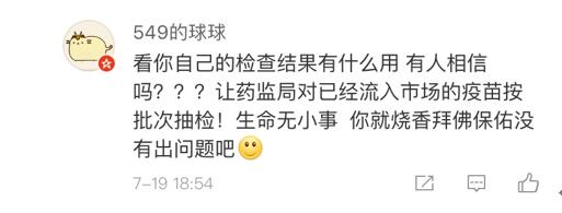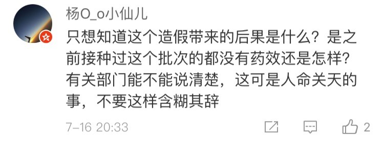 網(wǎng)友“楊O_o小仙兒”表示:“只想知道這個(gè)造假帶來的后果是什么?是之前接種過這個(gè)批次的都沒有藥效還是怎樣?有關(guān)部門能不能說清楚,這可是人命關(guān)天的事,不要這樣含糊其辭。”