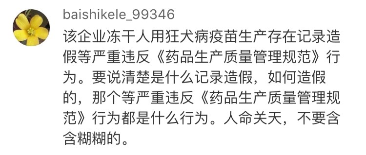 網(wǎng)友“baishikele_99346”認(rèn)為:“要說清楚是什么記錄造假,如何造假的,那個(gè)等嚴(yán)重違反《藥品生產(chǎn)質(zhì)量管理規(guī)范》行為的都是什么行為。人命關(guān)天,不要含含糊糊!