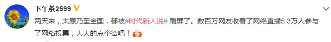 #時(shí)代新人說(shuō)#微博話題下不乏這樣的留言:“太原乃至全國(guó),都被‘時(shí)代新人說(shuō)’刷屏了”、“雖不是太原人,也刷著直播頁(yè)面,被時(shí)代新人說(shuō)的力量感染著”。