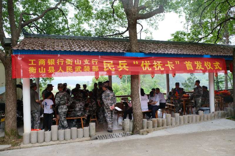 前不久,衡山縣人武部與中國工商銀行衡山支行舉行民兵“優(yōu)撫卡”首發(fā)儀式,給正在參加防汛演練的30余名基干民兵送去了一份特別的小禮物——“隨軍行擁軍優(yōu)撫卡”。 這張卡,是今年年初該縣人武部主動與銀行進行溝通協(xié)調后,專門設計制作的一張融身份識別功能與金融服務功能于一體的民兵優(yōu)撫卡?ǖ恼姹尘皥D案是一位身著軍裝的民兵照片,并印有“隨軍行擁軍優(yōu)撫卡”字樣。