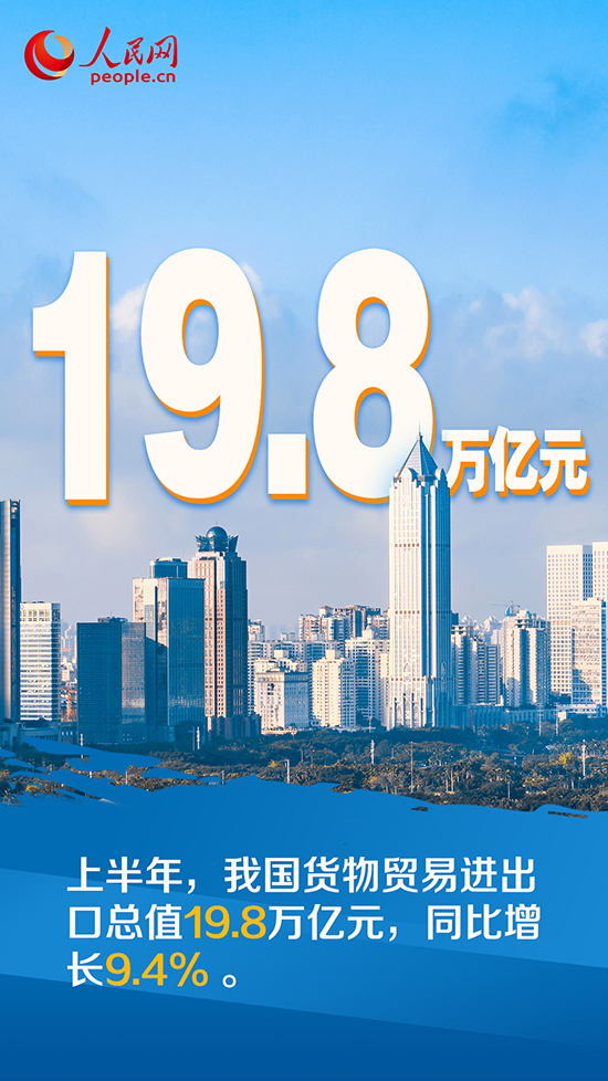 據(jù)海關(guān)統(tǒng)計(jì),今年上半年我國(guó)貨物貿(mào)易進(jìn)出口總值19.8萬(wàn)億元,同比增長(zhǎng)9.4%。其中,出口11.14萬(wàn)億元,增長(zhǎng)13.2%;進(jìn)口8.66萬(wàn)億元,增長(zhǎng)4.8%……上半年外貿(mào)進(jìn)出口“答卷”傳遞出我國(guó)經(jīng)濟(jì)持續(xù)恢復(fù)的積極信號(hào)。