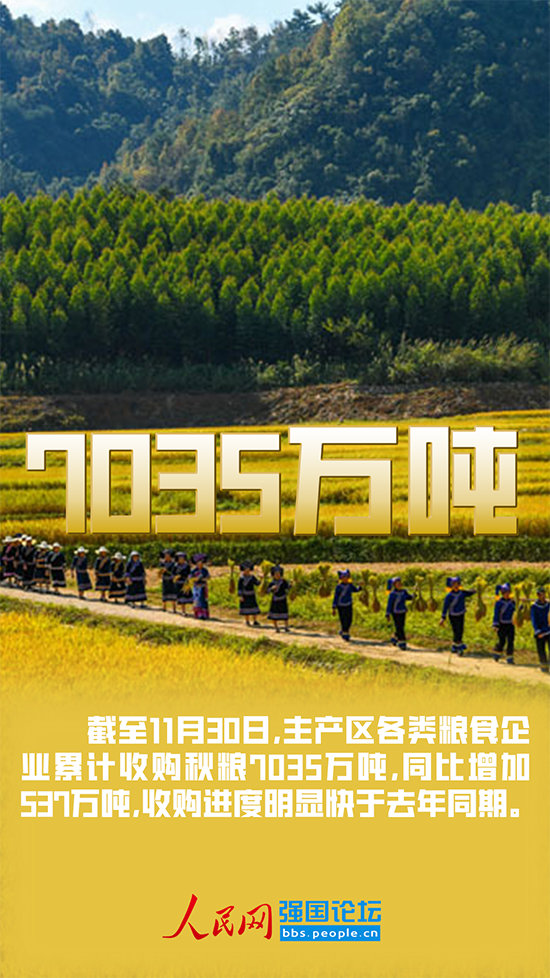 隨著各地大規(guī)模秋收結(jié)束,秋糧開始集中上市交易。據(jù)國家糧食和物資儲備局最新發(fā)布,截至11月30日,主產(chǎn)區(qū)各類糧食企業(yè)累計收購秋糧7035萬噸,同比增加537萬噸,收購進度明顯快于去年同期!跋啾扔2021年、2020年、2019年的6498萬噸、6803萬噸、5614萬噸,與歷年同期相比,今年達到了近年來糧食企業(yè)秋糧收購數(shù)量的最高值!崩钚潞Uf道。
