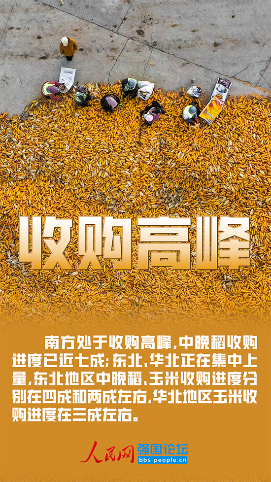 當(dāng)前,南方處于收購高峰,中晚稻收購進度已近七成;東北、華北正在集中上量,東北地區(qū)中晚稻、玉米收購進度分別在四成和兩成左右,華北地區(qū)玉米收購進度在三成左右。