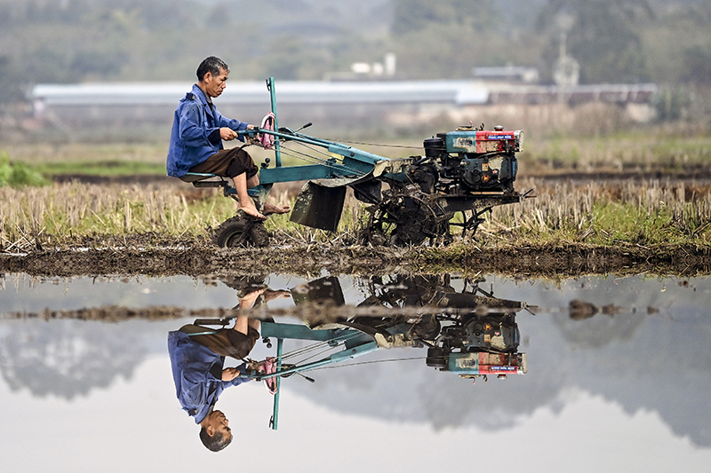 2月17日,廣西欽州欽北區(qū)大寺鎮(zhèn)農(nóng)民在翻耕稻田。新華社記者 張愛(ài)林?jǐn)z