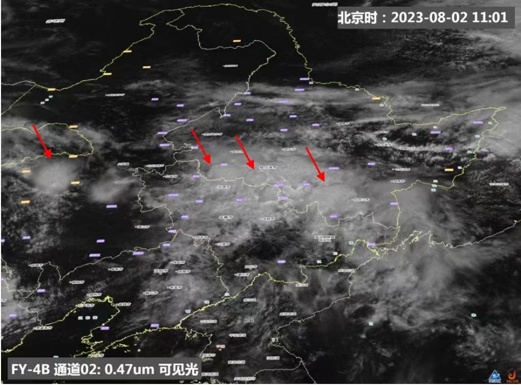 風(fēng)云四號(hào)B星可見(jiàn)光圖像顯示,黑龍江南部、吉林省北部以及內(nèi)蒙古中東部局地的對(duì)流活動(dòng)明顯,出現(xiàn)白亮的上沖云頂。圖片來(lái)源:國(guó)家衛(wèi)星氣象中心